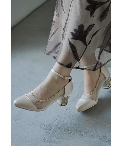 艶やかなサテンと繊細な透け感のシアー素材を組み合わせたパンプス。