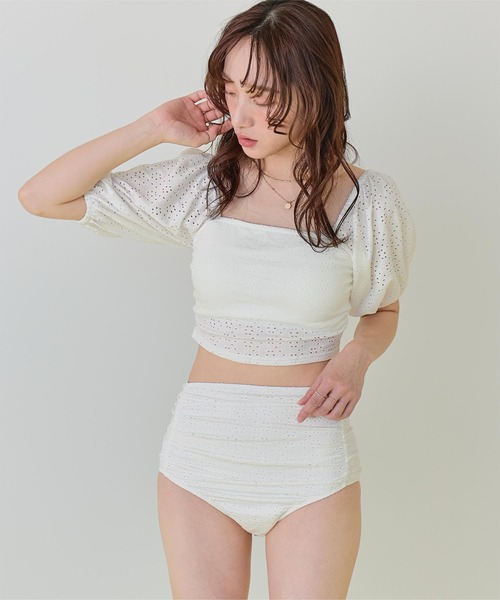 ・パフスリーブデザイン×レース素材が大人可愛いハイウエストビキニ。