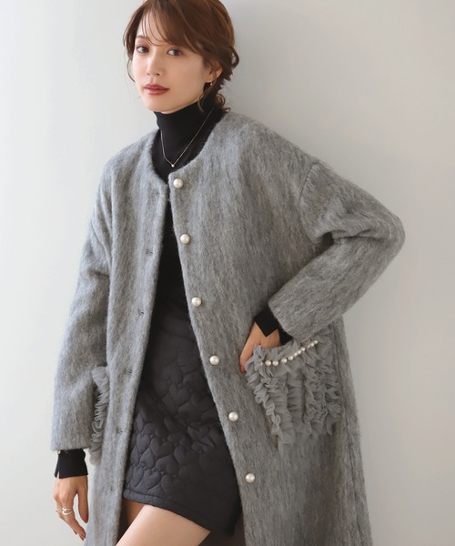 ポケット部分のチュールが印象的な、クラシカルで華やかなロングコート。