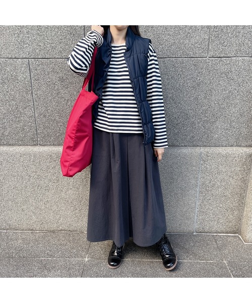 インナーには着合わせなしやすいボーダーのロンTを合わせて。身生地はストレッチミニ裏毛を使用。
