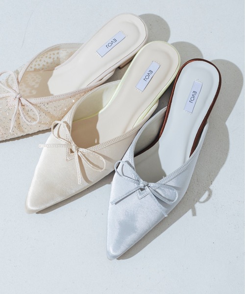 【EVOL 2025SS collection】シャープな見た目が綺麗めなミュール。パカパカするイメージがあるミュールデザインですが、こちらはVカットですっきり見えつつサイドでしっかりホールドしてくれるので、見た目以上に歩きやすいのがポイントです。柔らかいサテン生地はとにかくソフトで履きやすい!ローヒールでカジュアルコーデにも合うので1足持っておくとヘビロテ間違いなしのアイテム◎