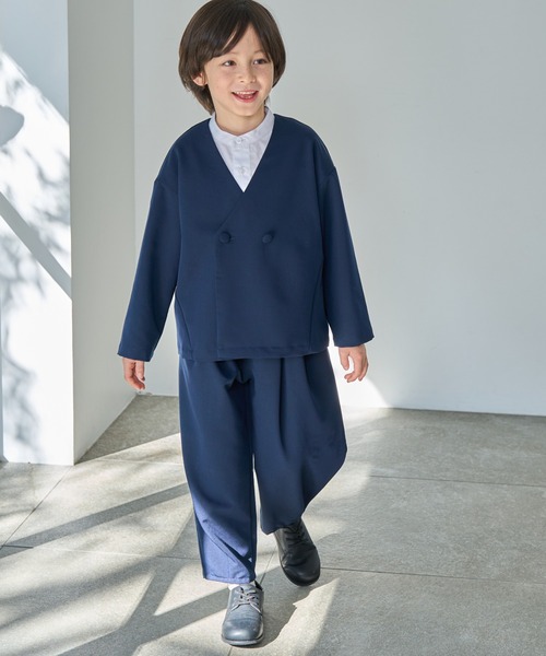 ノーカラージャケットのきちんと感と、バルーンパンツのゆったりとしたシルエットで、お子さまが楽しく快適に過ごせる1着です。
