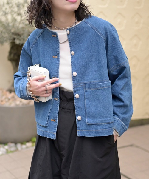 デニム/デニムジャケット/トレンド/大人カジュアル/カジュアル/ジャケット/羽織もの/ノーカラー/ライトオンス/ノーカラージャケット/ロングシーズン