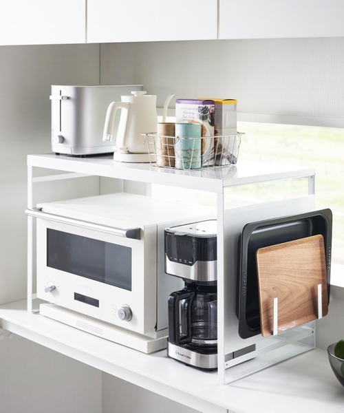 大きめのオーブンにも使えるワイドなレンジラックです。天板上やレンジ横にキッチン家電やキッチン小物を自由に配置。