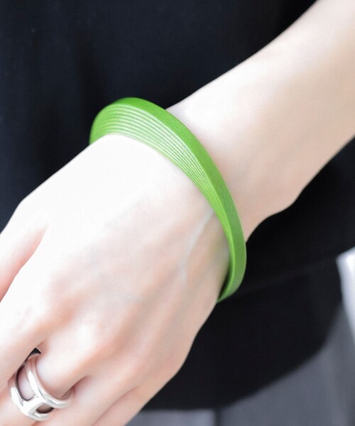 テープ状の天然ブナ材をコイルのように巻き重ね、少しずつずらしながら立ち上げて〈BUNACO〉らしい柔らかな曲線のバングルです。アクセントになる鮮やかなカラーも魅力です。