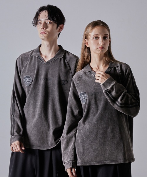 市場に多く見られるゲームシャツはナイロン系素材でカジュアルな印象。コーデに取り入れるのが難しいと感じる方に向けて、Tシャツ感覚でラフに着用できるよう、綿100%のカットソー天竺素材を採用。シルエットは、ややルーズめでラグラン仕様のため、特に腕周りが窮屈感なくリラックスした着用感。Vネックにポロ襟をリブ編立で仕上げることで、ラフさの中にもきちんと感を演出。ボディデザインにはゲームシャツらしいデザインを施しつつ、ボディ自体はシンプルに仕上げ、どんなコーディネートにも合わせやすくしました。ワッペン部分は、ヴィンテージ加工による視認性や質感の変化を考慮し、あえて後付けで仕上げ、テキストには「EDGEFLOWER(造語/縁のある仲間達)」、「GUARANTEED(保証する)」のメッセージを込めています。プリント部分は、ボディの加工感に馴染む掠れロゴプリントを採用。「ROVIBE(ノリの合う渡り者)」というオリジナルの造語をデザイン。刺繍部分はCLELの「C」と「L」を組み合わせたブランドのアイコン刺繍を配置。製品加工を施すことで、トレンド感あふれるグランジテイストを実現。加工ならではの1点1点違った個体差やユーズド感、フェード感のあるカラーリングをお楽しみください。