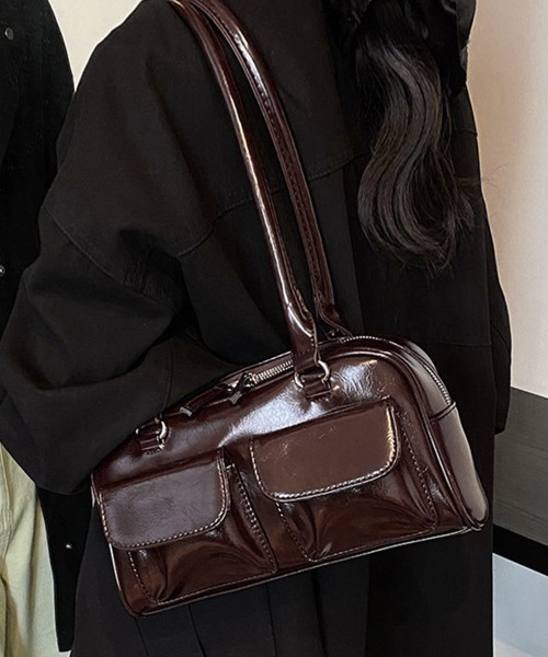 ツヤ感トートバッグ マチ広めハンドバッグ おしゃれ マルチポケット 学生カバン 韓国風通勤通学 PUレザーバッグ 高級感