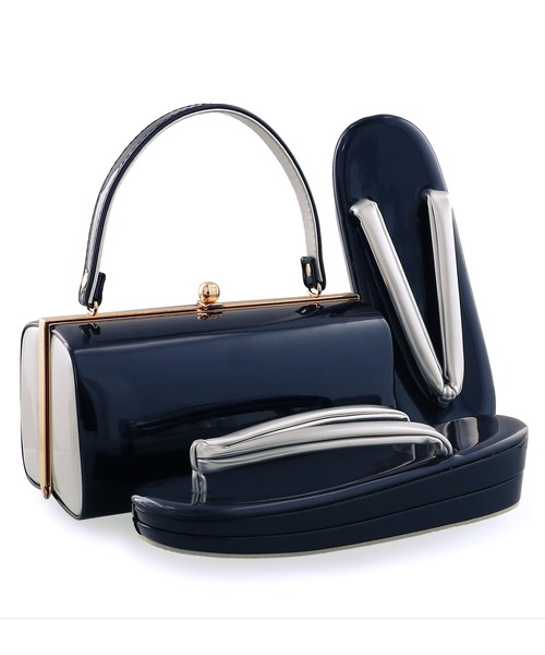 A.深藍×銀(ネイビー):バッグの裏表、持ち手の表は艶のある深い紺藍。バッグ側面、持ち手の裏はシルバー。口金はゴールド。寒色に銀色がクールで上品な組み合わせです。草履の鼻緒はシルバー、台は深い紺藍。
