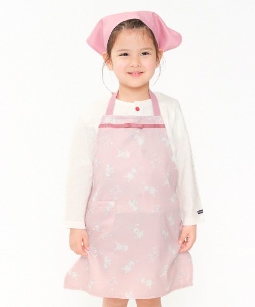 オフホワイトは花柄のエプロンとラベンダー無地の三角巾、ピンクはうさぎ柄のエプロンとピンク無地の三角巾のセットです。