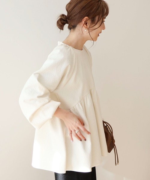 ラグランラインから広がるボリュームスリーブやフレアシルエットがフェミニンな印象の1着です。