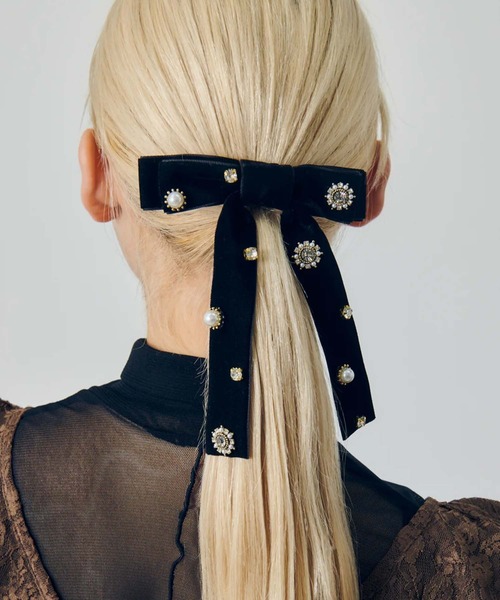 ベロアのリボンに様々なビジューが散りばめられた存在感のあるデザイン。