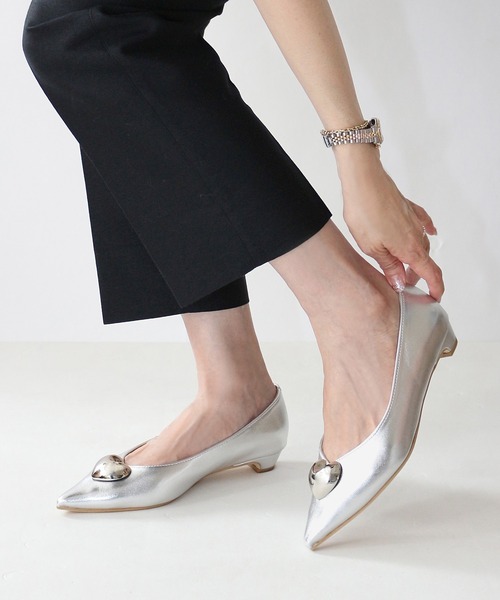 すっきりとしたポインテッドトゥにVカットデザインがすらっとした足元を演出するFin(フィン)のハートモチーフフラットシューズが登場。シルバーのハートモチーフは艶感があり足元に程よいアクセントを与えてくれるはず。ニュアンス感のある形なので大人の女性も挑戦しやすそう。2.6cmのヒールやカットラインなど、足元全体のバランス感がシルエットの綺麗なスタイリングを完成させてくれます。
