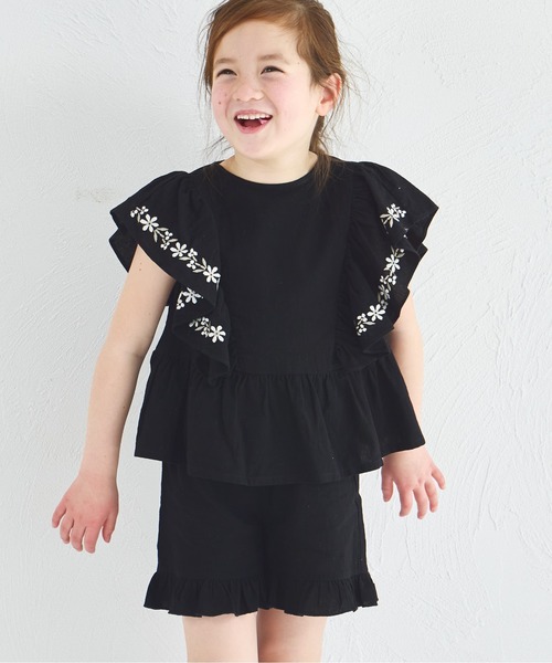 花柄刺繍が施されたブラウスとショートパンツの2点セットです。