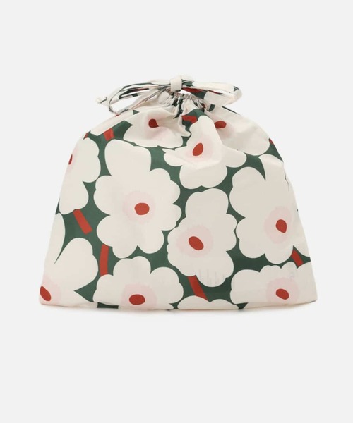 花をモチーフにしたUnikko柄をホワイト×ダークグリーンで仕上げた、用途に合わせて様々な使い方ができるバッグ。間口が大きく開く巾着仕様で小物類をまとめるのに便利です。フロントにはブランドロゴ入りタグを添えてワンポイントに。