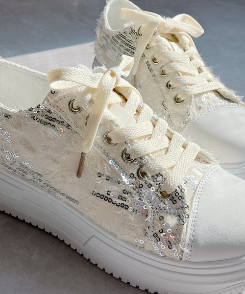 アッパーに施されたクラッシュ加工と、キラリと光るスパンコールモチーフが目をひく一足。