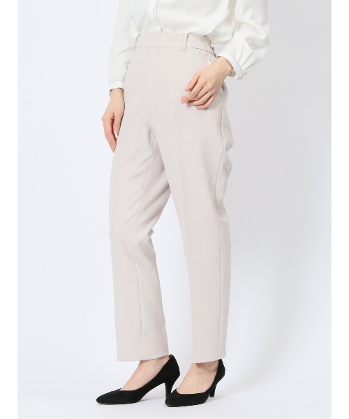 すっきりとしたノータックのテーパードパンツです。センタープレスでキチンと感のある印象に仕上げています。ウエストはバックシャーリング仕様で着用ストレスを軽減。前ファスナー仕様、ベルト通し付き、ポケット付きです。