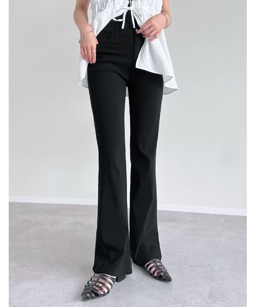 通年人気のブラックスキニーパンツ(商品番号:101707)と同じ生地でお作りした、スーパーストレッチキックフレアパンツです。