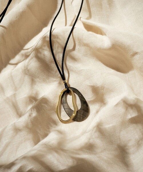 ■デザイン・素材シェルリングとメタルリングが重なったアクセントになるデザインのトップネックレスです。紐スライドのデザインなので簡単に着脱ができ、気分に合わせてお好みの長さで着用していただけます。メタルのリングはニュアンス感のある抑揚をつけたデザインになっています。程よいボリューム感でシンプルなコーディネートのアクセントに最適です。カラーは大人の可愛さを感じさせるホワイト(#001)、カジュアルなスタイリングにも合わせやすいブラウン(#035) 、シックな雰囲気のブラック(#005)の3色展開です。