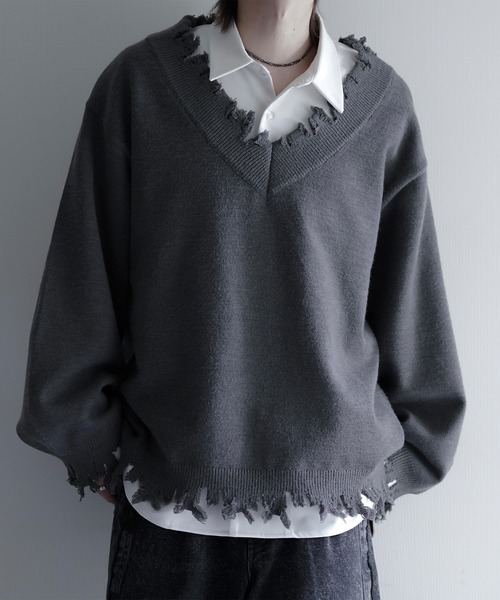 絶妙なダメージ感が映えるVネックニット。