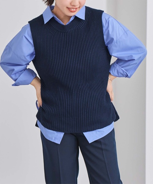ざっくりとした畦編みが特徴のニットベスト。腰回りをカバーする絶妙な着丈設計で、1枚でトップスとして着るだけでなく、シアートップスや襟付きシャツとレイヤードしてさまざまなコーディネートを楽しむことができます。