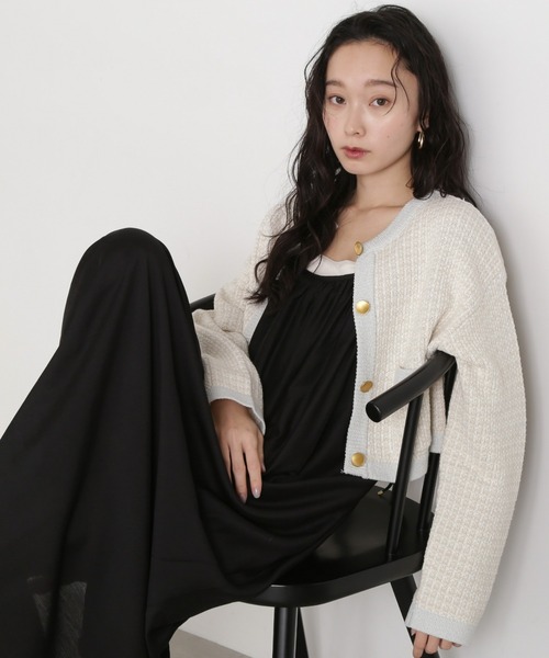 ツイードライクに仕上げたニットブルゾンは、きらっと釦もアクセントになり、カジュアルすぎず上品に着こなせるデザイン。