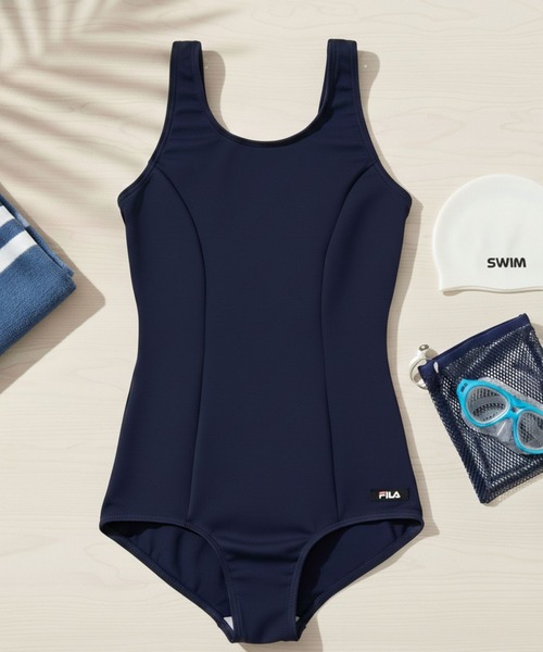 学校の授業やスイミングスクールでの着用に最適なスクール対応のスイムウェア。ベーシックでクラシカルなワンピース型で、FILAのピスネームが付いたシンプルなデザインです。