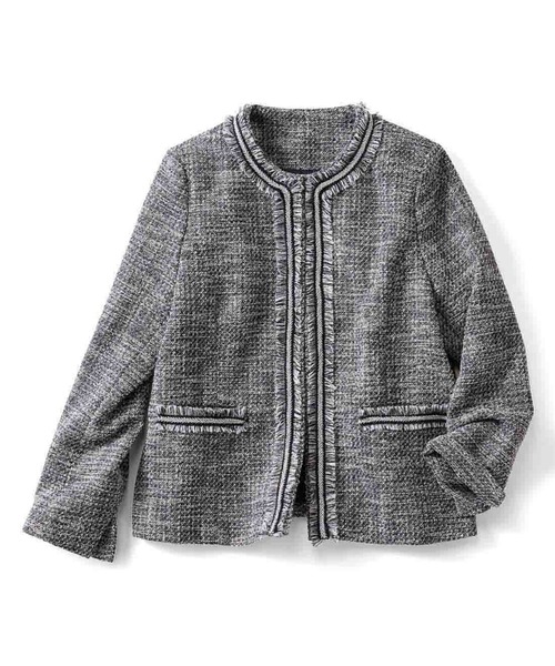 王道にしてトレンド感のある万能ツイード落ち着きのあるダークグレーのミックスツイードに、フリンジとラメのブレードが上品な華やぎ。