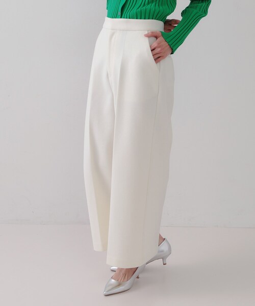 ・広がりすぎないストレートワイドシルエットと、センタープレス入りで脚長効果が期待できるデザイン。