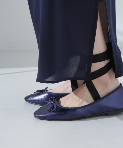 カジュアルな印象で合わせられるラフな印象のバレエシューズ。シンプルなバレエシューズタイプと、セットのリボンテープを甲上でクロスして足首に巻いて履くタイプの2WAY仕様。キラッと光るメタリックカラーが足元にトレンド感を与えてくれる旬なアイテムです。