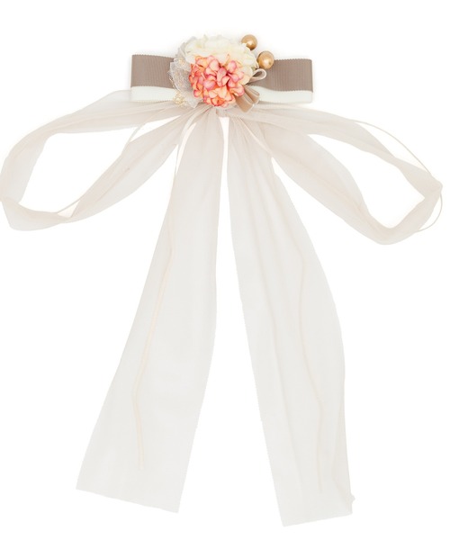 柔らかな生地のドライフラワー調の花、グログランリボンや透け感のある長いチュール生地が可愛いデザインです。