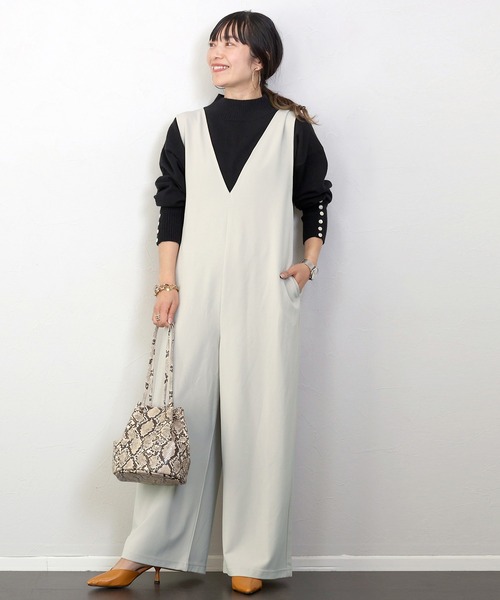 深めのVネックがパンツスタイルを女性らしく仕上げてくれる大人に似合うサロペット。