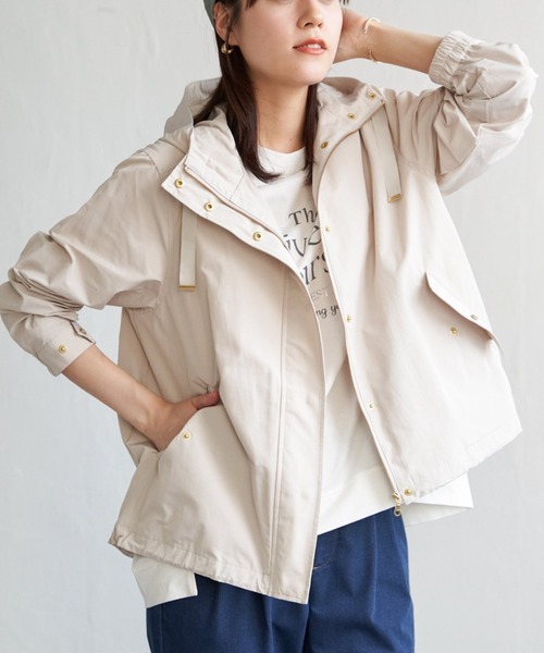 フードにグログランテープ、ボタンやジップにはゴールド付属などさり気ない女性らしさを加え、華やかさに。