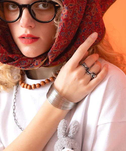 まるでエジプトなどの古代文明のクイーンジュエリーを彷彿させるようなゴージャスな雰囲気がインパクトフル。煌びやかになり過ぎないモチーフなしのシンプルかつ無駄を削いだミニマルなスタイルがエレガント。シルバー、ゴールド、ブラックシルバー(ガンメタリック)のキャラクターが異なるカラー展開でストリートやモードスタイルはもちろん90s/Y2Kやアメカジ、古着ミックススタイルなど様々なコーディネートやアイデア、ニュアンスにもしっかりと対応。耐候性に優れたスチールを使用し、毎日使う事で経年劣化でのアンティークな風合いを自分色に『育てる』楽しみも。