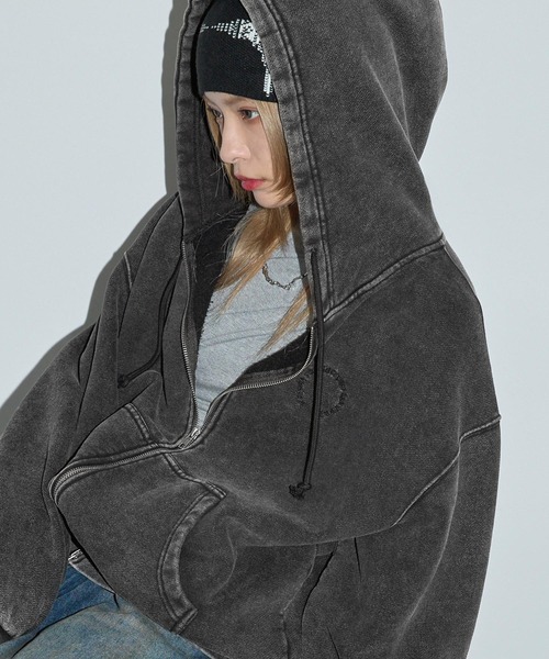 スノー加工×ヴィンテージ感×ダブルジップデザインのトレンド要素満載なジップパーカー。