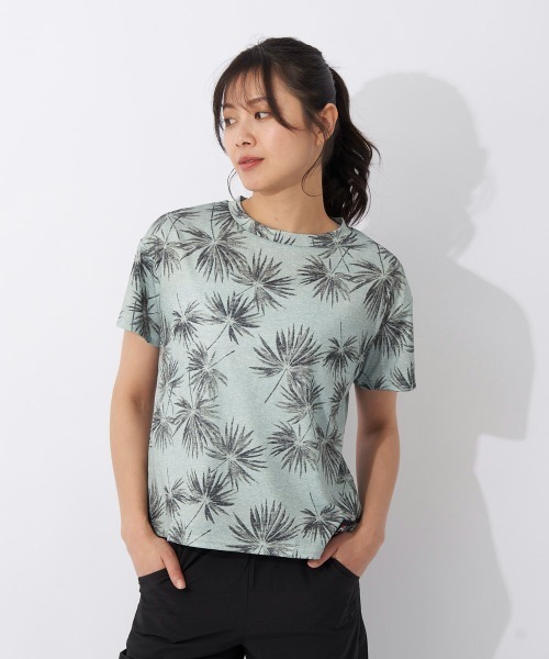 水陸両用。ポリエステルスムースのUV、速乾素材使用。鮮やかなリーフプリントのTシャツです。裾のFILAロゴアップリケがポイントです。