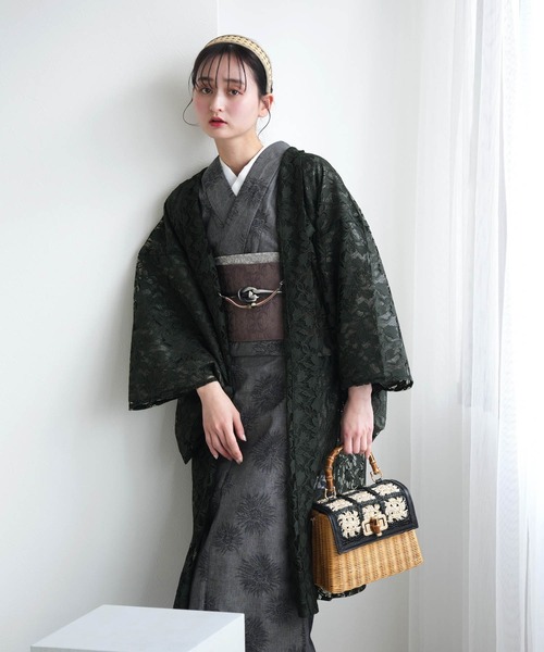 長羽織 羽織 着物 レディース 花柄 日本製 国産生地 塵除け フリーサイズ 透け感 シースルー 和装コート アウター カジュアル お洒落 上品 エレガント 暗緑 黒緑