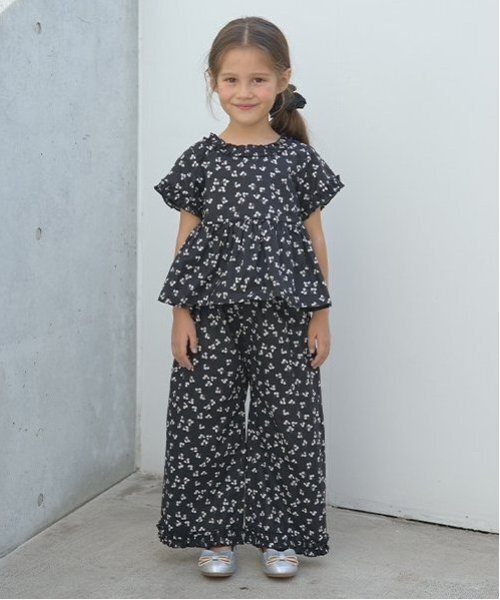 トップスの衿ぐりと袖口、パンツの裾にあしらわれたフリルがポイント。