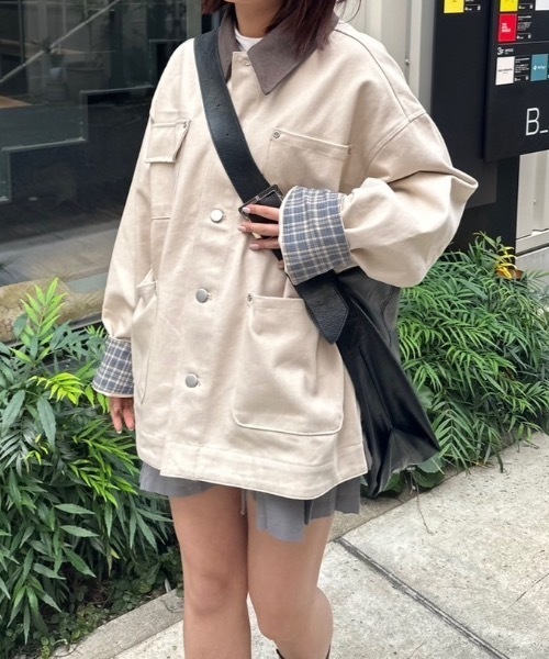 トレンドの襟配色カバーオールに袖のチェック裏地がポイントの襟袖異素材カバーオール。