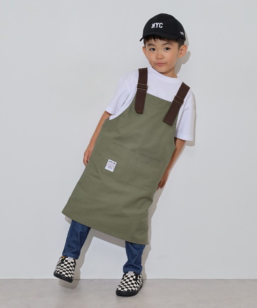 お子様でも一人で着脱しやすいカバーオールタイプのキッズエプロンです。