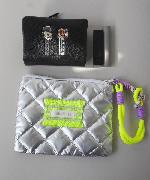 バッグの中でも見つけやすいメタリックカラー×カラフルなストラップ付きのフラットポーチ。