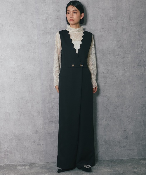 深めのVネックデザインで、スカラップカットが施されており、フェミニンな印象を与えます。