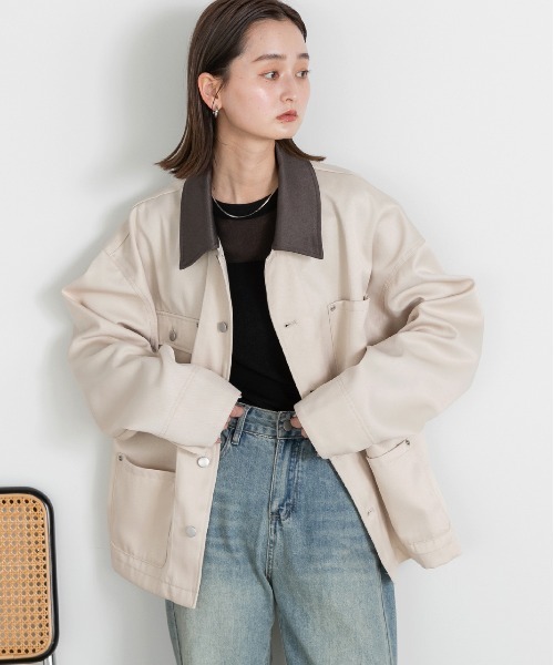 襟の配色がアクセントになるワークジャケット