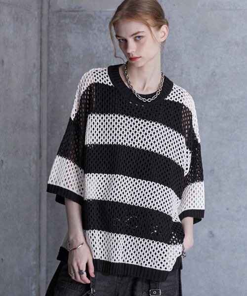 ・ざっくり編みとサイドスリット入りで透け感と抜け感を両立し、Tシャツやタンクトップとのレイヤードスタイルに最適