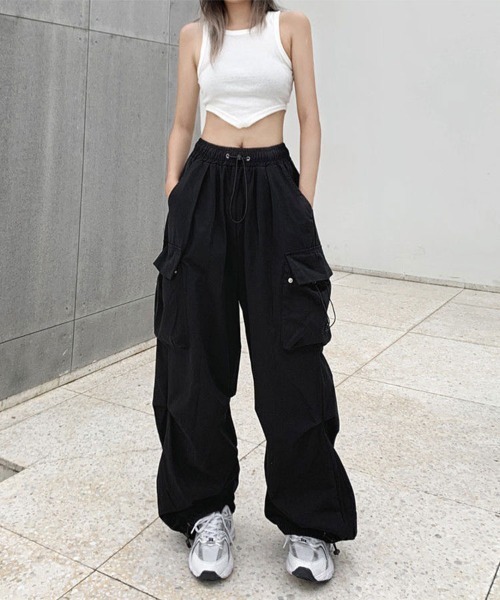 大きめなポケットが付いたゆったりルーズシルエットのカーゴパンツです。
