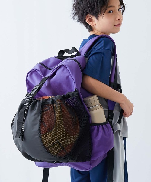 バスケットボールやシューズなどを前のポケットにすっぽり収納できるリュックができました。かさばる荷物や、蒸れて臭いが気になるものを持ち運ぶときに役立ちます。