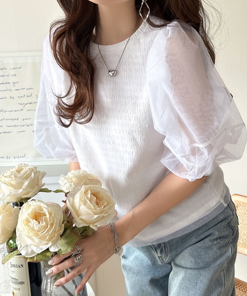 トレンドのチュールスリーブが目を引くフェミニンプルオーバー。