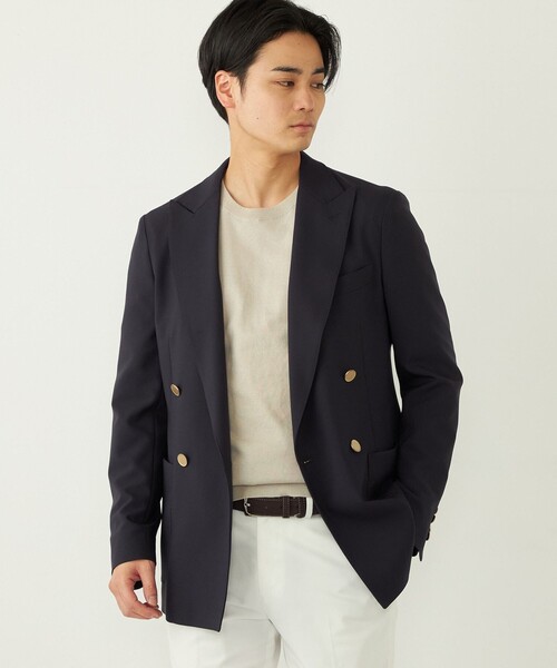 メタルボタンを配したダブルブレストのネイビーブレザー。
