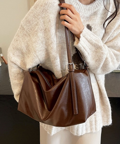 ワッシャーPUレザーを使用し、くったりとしたボックスフォルムに仕立てた大人かわいいデザイン♪