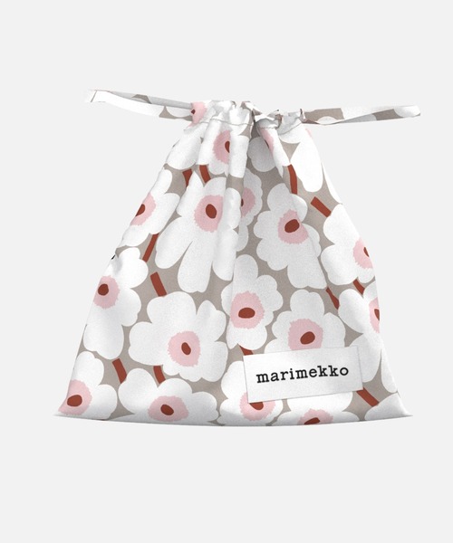 様々な小物類をまとめるのに便利な巾着型ポーチ。軽くて柔らかい布製で扱いやすく、バッグの中に入れてもかさ張りにくくなっています。ホワイトとライトグレーの優しい色合いが上品なUnikko柄、ワンポイントのブランドタグなども魅力。ご自身用はもちろん、贈り物にもおすすめのアイテムです。