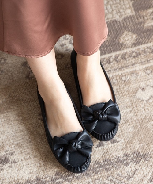 大きめのふわっとリボンが目を引くモカシンシューズ。